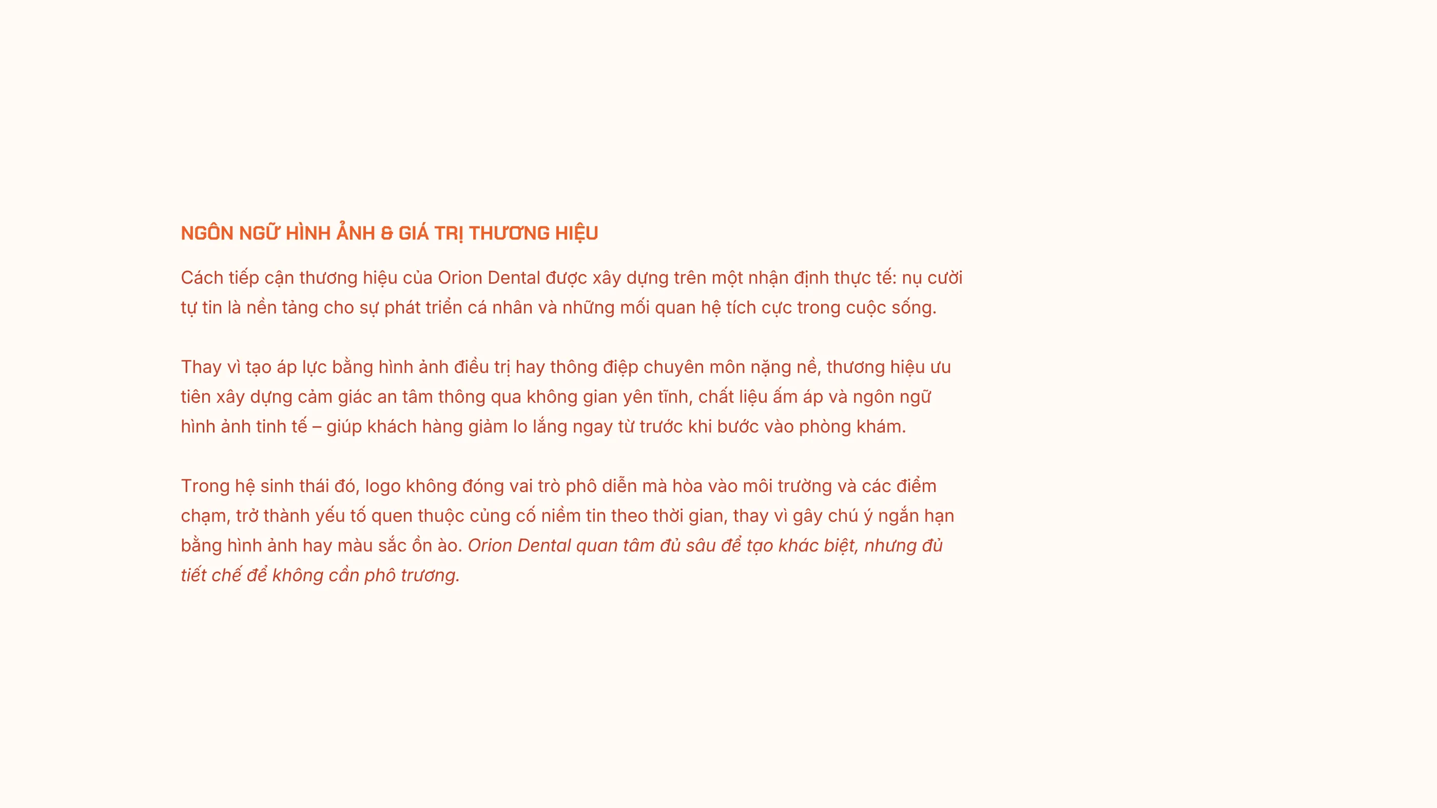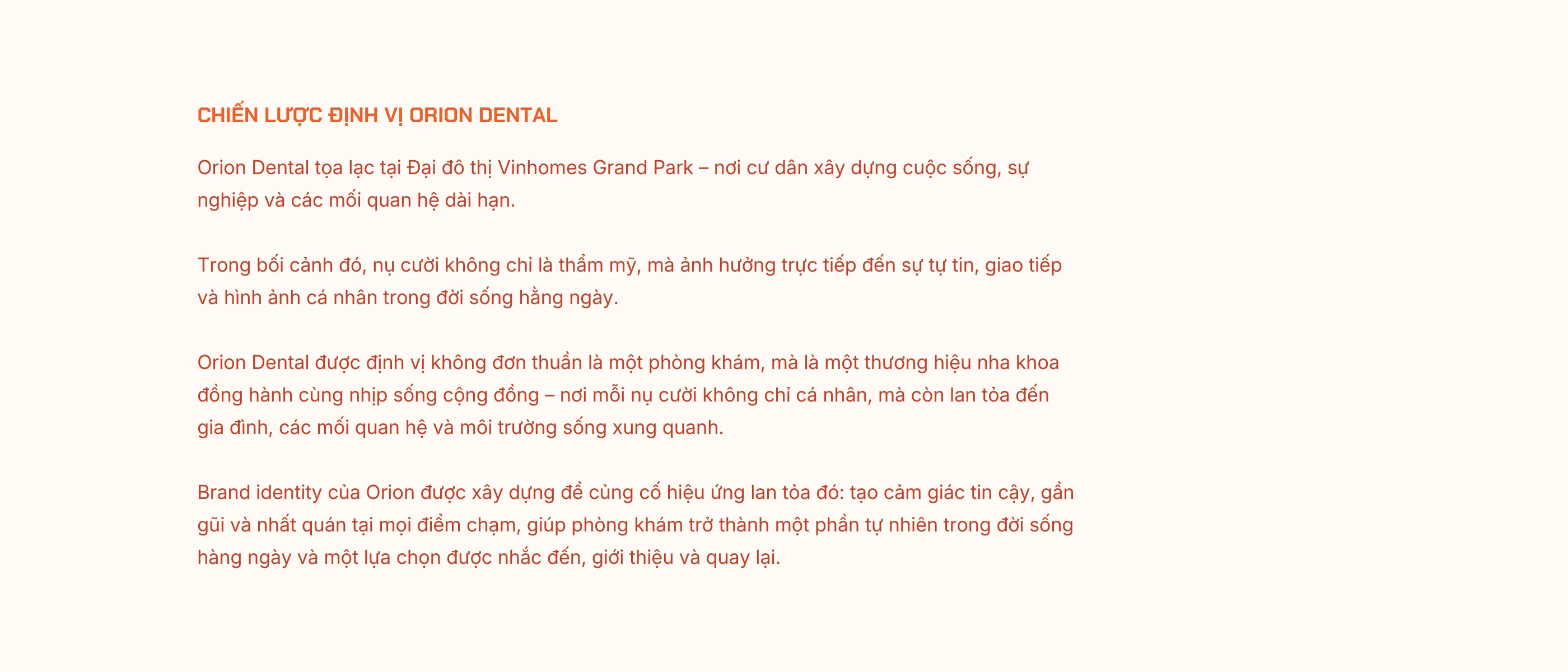 Orion Dental được định vị như một thương hiệu nha khoa gắn với đời sống của cộng đồng cư dân Đại đô thị. Thay vì nhấn mạnh yếu tố điều trị, hệ thống thương hiệu tập trung vào cảm giác tin cậy, gần gũi và tính ứng dụng hằng ngày, giúp nha khoa trở thành một phần tự nhiên trong nhịp sống nơi nụ cười được lan tỏa, và không phải một trải nghiệm mang tính “phòng khám”.